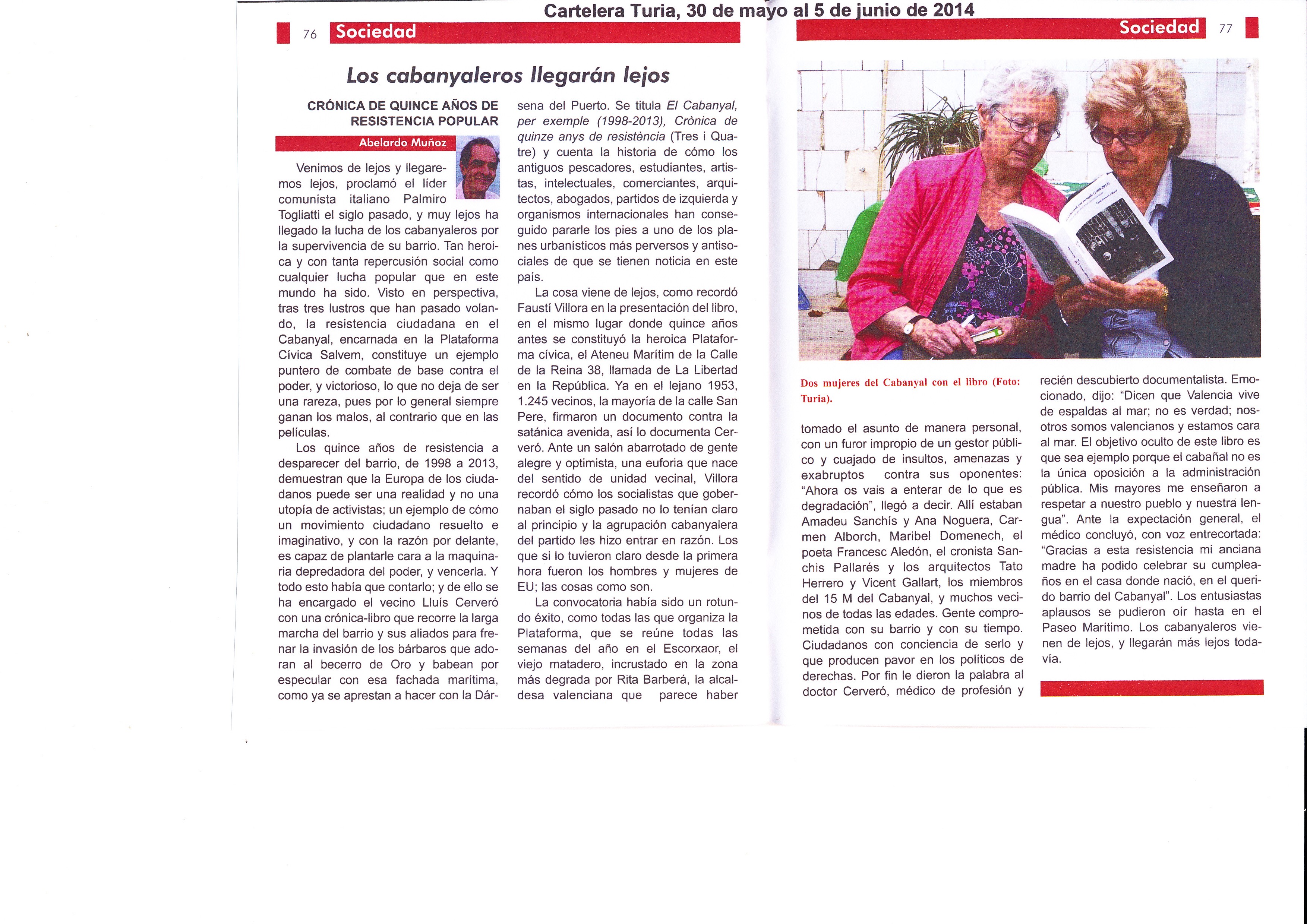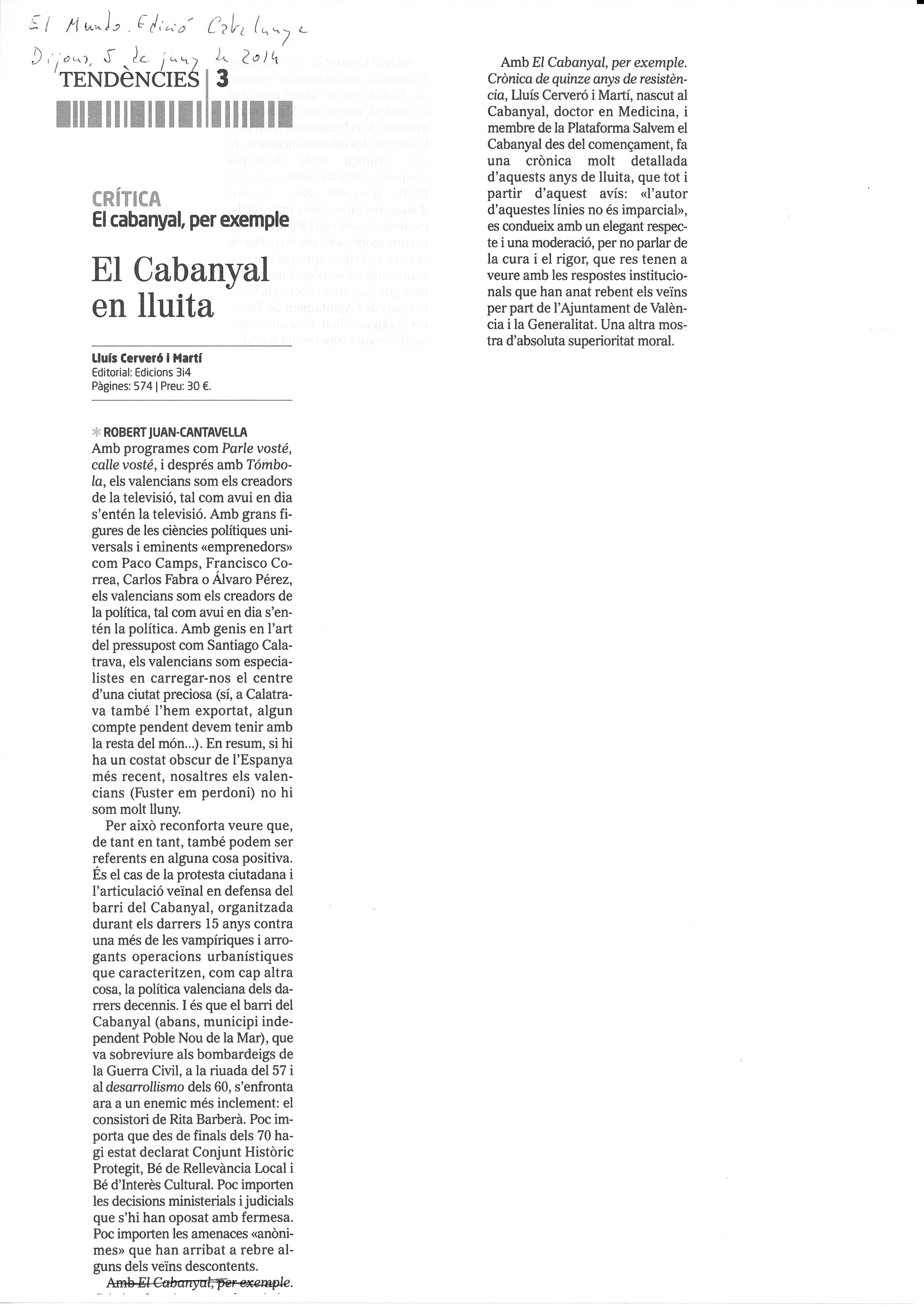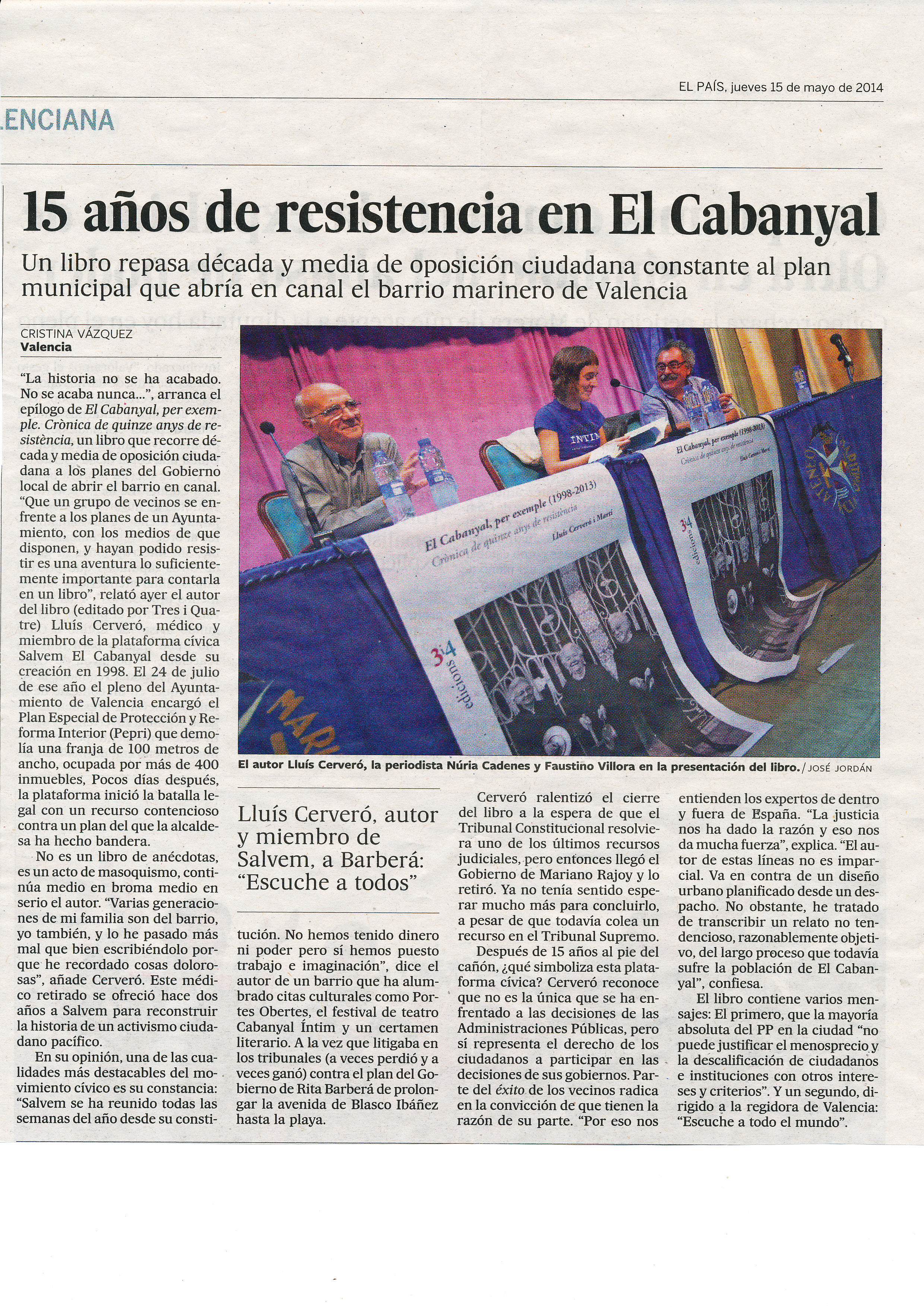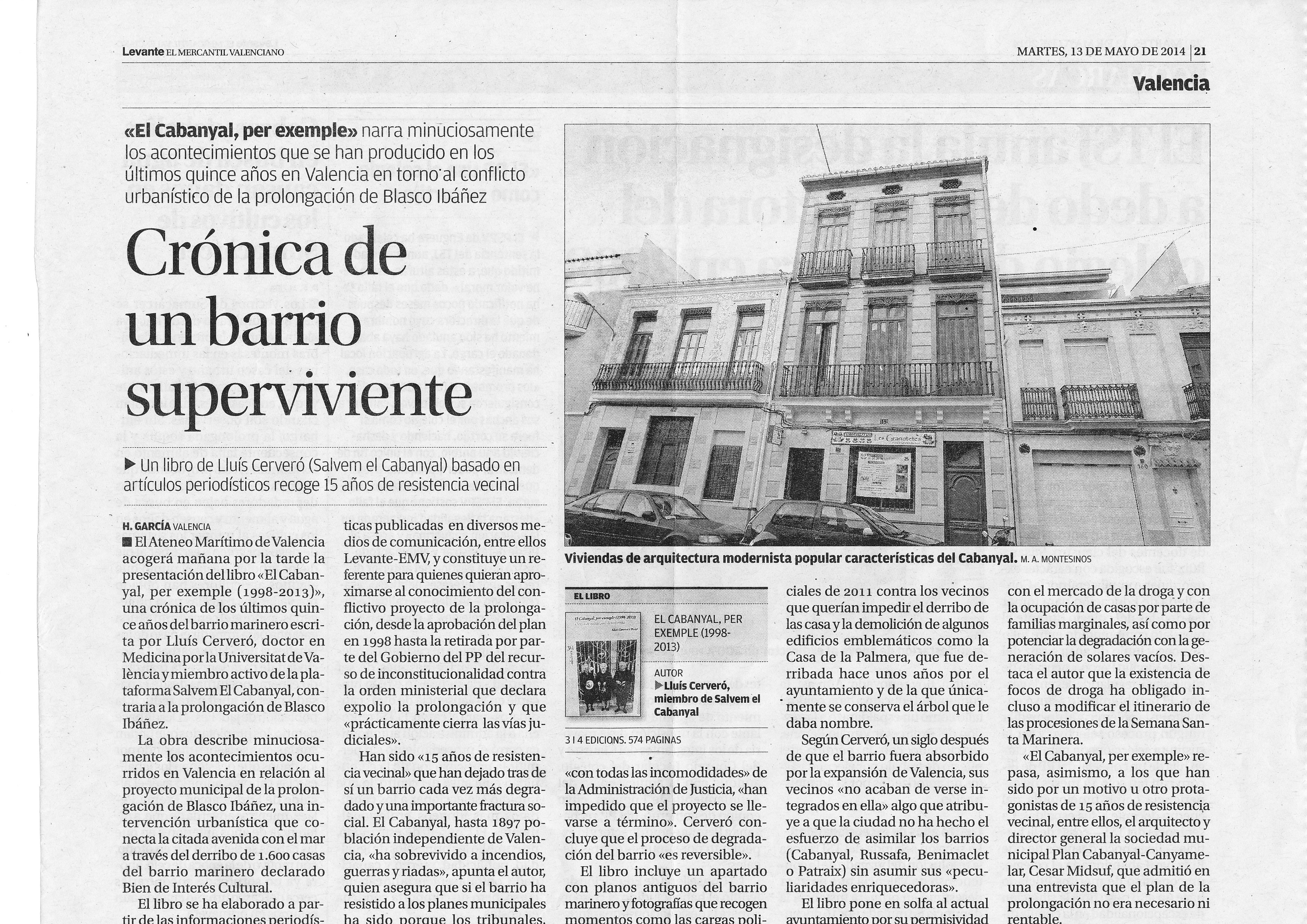 El Cabanyal, per exemple descriu amb minuciositat els esdeveniments ocorreguts a València arran del projecte municipal de prolongació de l’avinguda de Blasco Ibáñez fins a la mar. Basant-se fonamentalment en les notícies aparegudes en la premsa escrita —valenciana, espanyola i, de vegades, internacional—, l’autor recorre els quinze anys passats entre el 1998, en què l’Ajuntament de València decideix d'executar el projecte, i el 2013, en què, amb la retirada per part del govern del Partit Popular d’un recurs d’inconstitucionalitat, es tanquen pràcticament totes les vies judicials. Malgrat la militància de l’autor contra el projecte municipal, l’exhaustivitat en l’arreplegada i selecció de les dades, el rigor de les descripcions i l’acurada ordenació del llibre el converteixen en un referent per a tothom qui vulga aproximar-se al coneixement del conflicte que, des de fa tants anys, enfronta una bona part del veïns del Cabanyal amb el seu ajuntament.