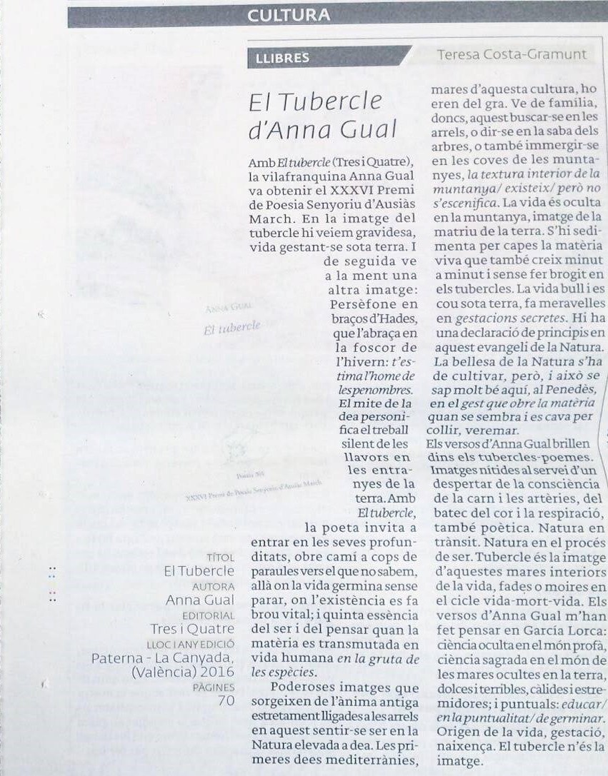 El tubercle és una obra que indaga en les profunditats, tant tel·lúriques com espirituals, per aconseguir una proposta mística, radical, arriscada i plena d'epifanies que sorprendran al lector per la seva fonda capacitat de sorpresa. A través d'aquests poemes, que funcionen com perles de saviesa, l'autora demostra la força indòmita que la caracteritza, erigint-se com una de les veus incontestables de la poesia catalana actual. Aquest llibre, a més d'un viatge a l'ànima, és també la segona part de la trilogia Arrel Trinitat, integrada per Molsa, El tubercle i Altres semidéus. Epíleg d'Antònia Vicens i il·lustracions de Lara Costafreda.