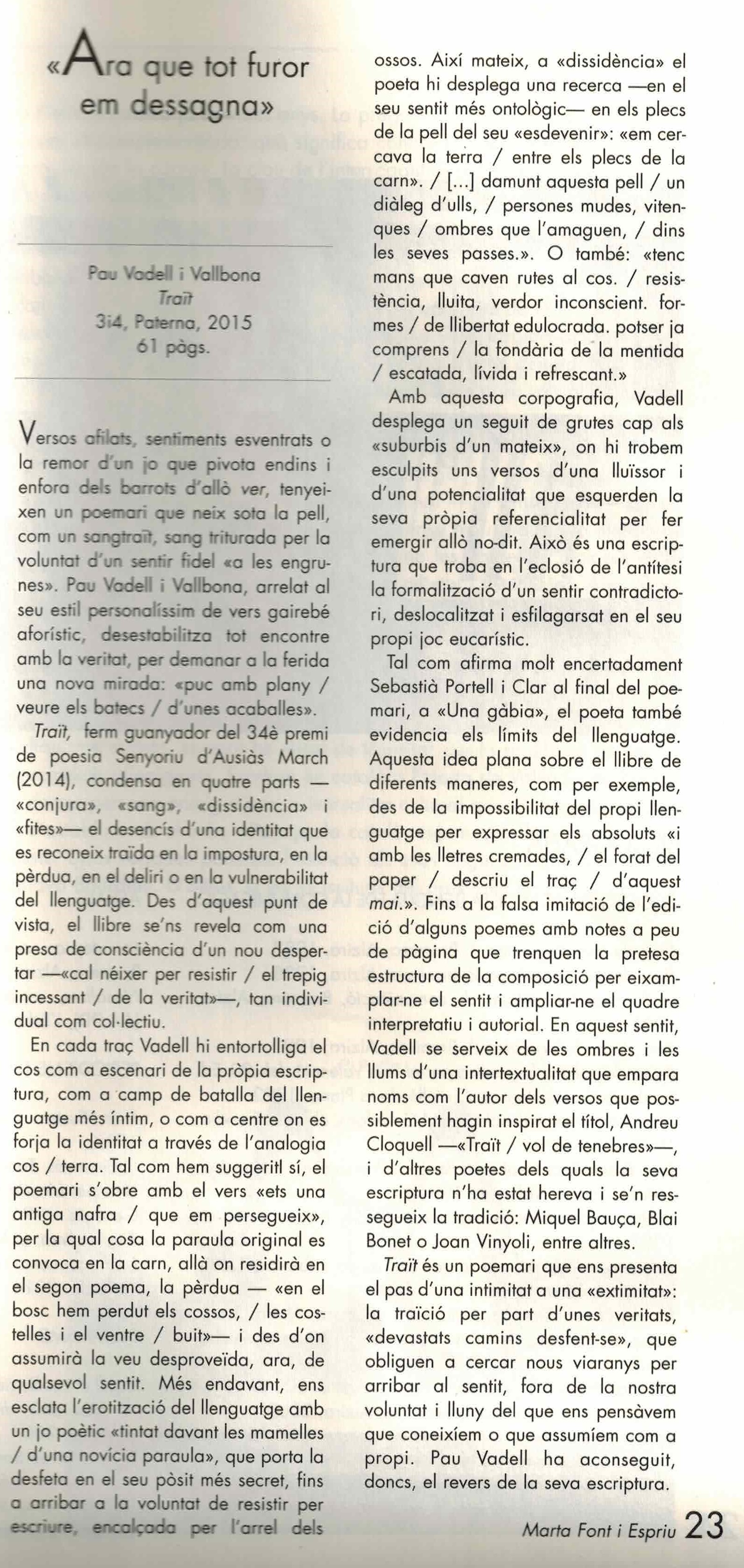 Sense por de patir cap altra traïció que la que pot suposar el propi llenguatge, són poques les coses que es puguin afegir a un text tan directe i ple de veritat com Traït, de Pau Vadell i Vallbona, 34è Premi de poesia Senyoriu d’Ausiàs March. […] La traïció que sobrevola aquests poemes pren formes diverses. És, per una banda, la traïció que la persona pateix per part de la resta d’individus, el que sovint s’anomena societat. Tots aquells que furguen les entranyes del poeta, que li suposen una antiga nafra, un corc que s’afica, un ganivet de fil prim i tall gruixut. És la traïció de la guerra oberta i de la postguerra, de la fecundació de la por i de les ortigues, d’aquells que urbanitzen el mapa de l’escriptura a marxes forçades i que ens obliguen a gratar entre el seu ciment inútilment, amb les ungles. És també la traïció que el llenguatge imposa al poeta, la gàbia en què l’atrapa.